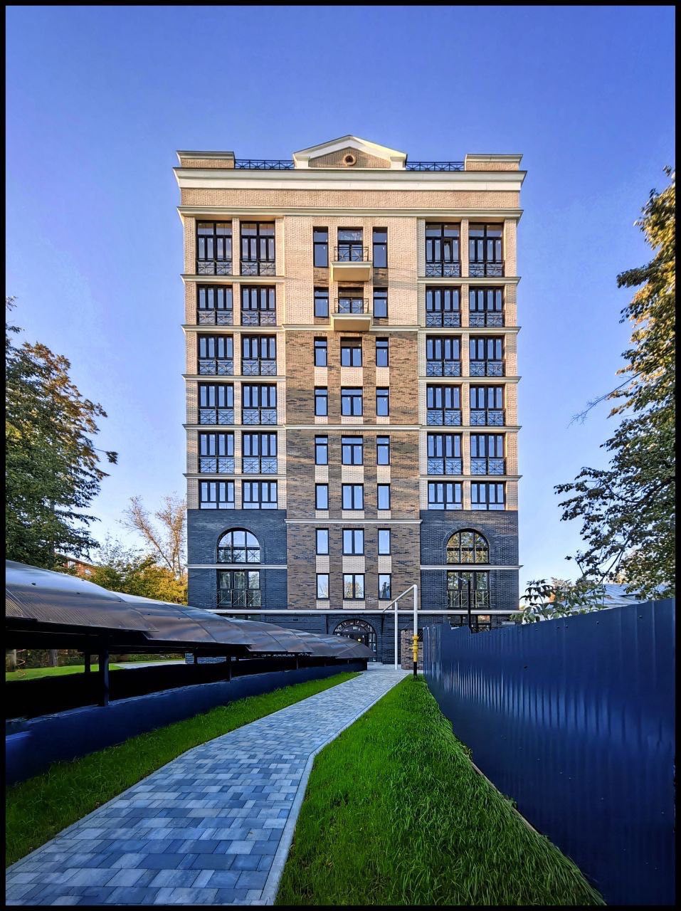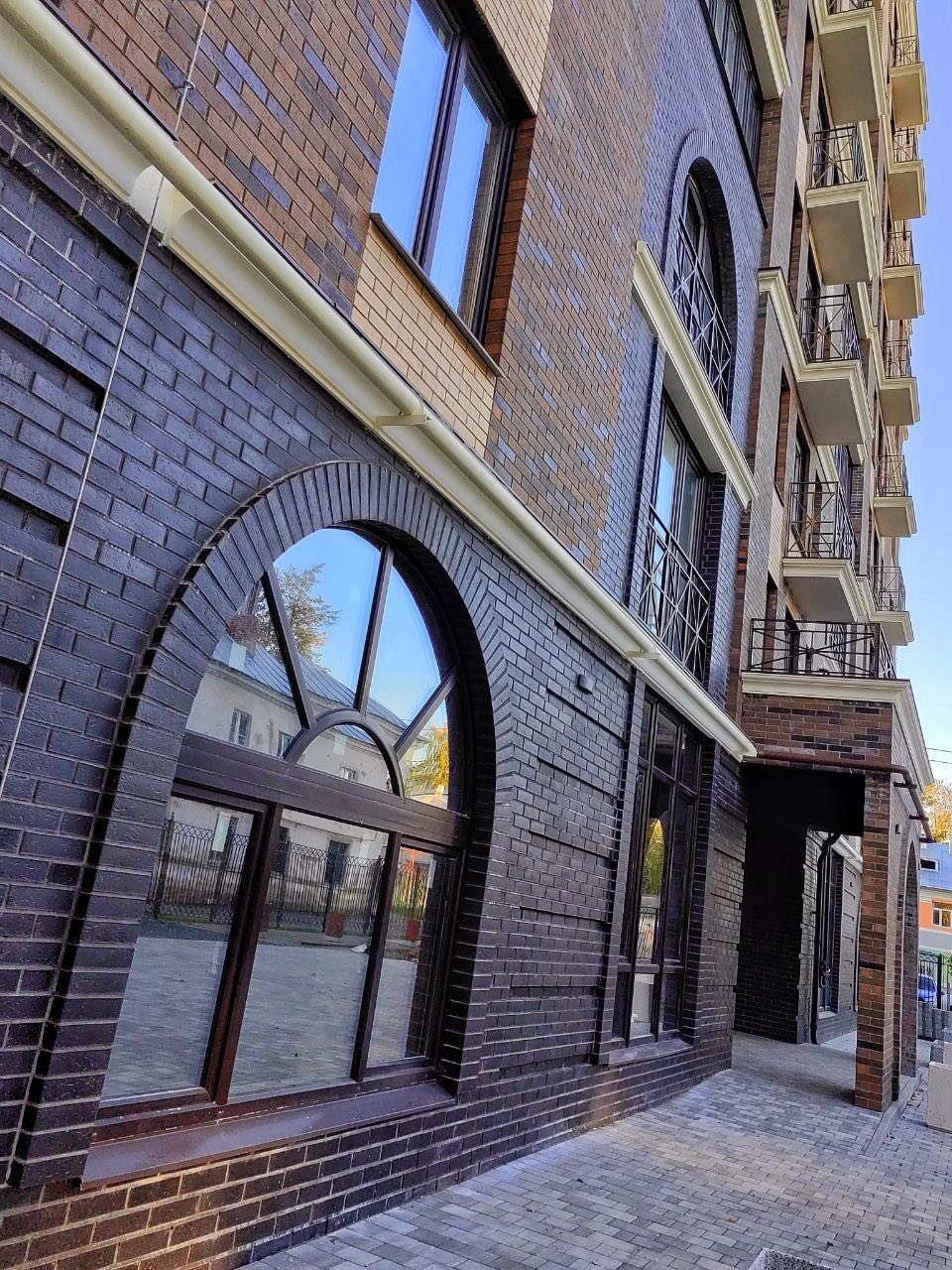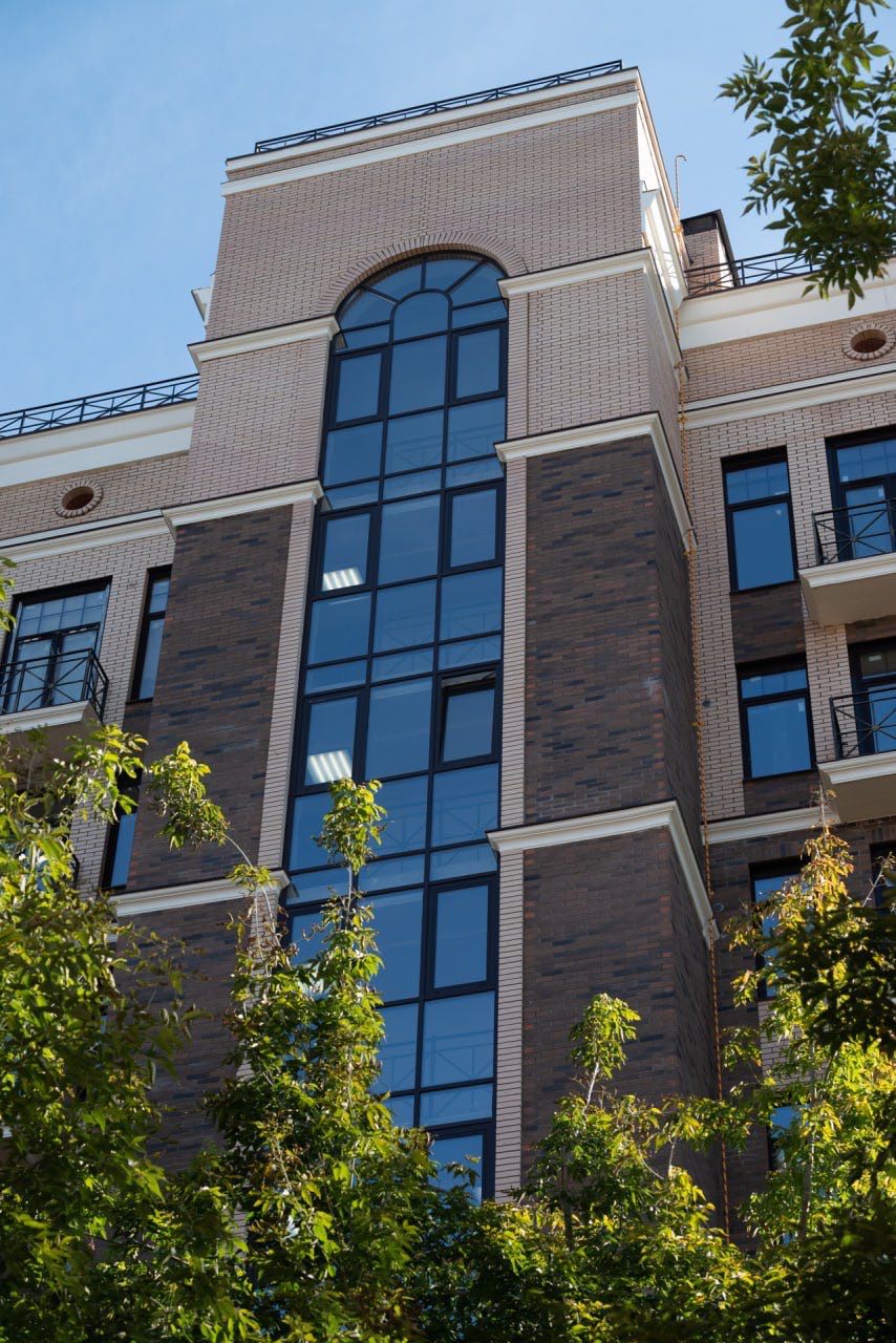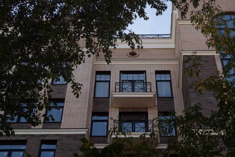 - Рустовые элементы и классические пилястры по углам здания
